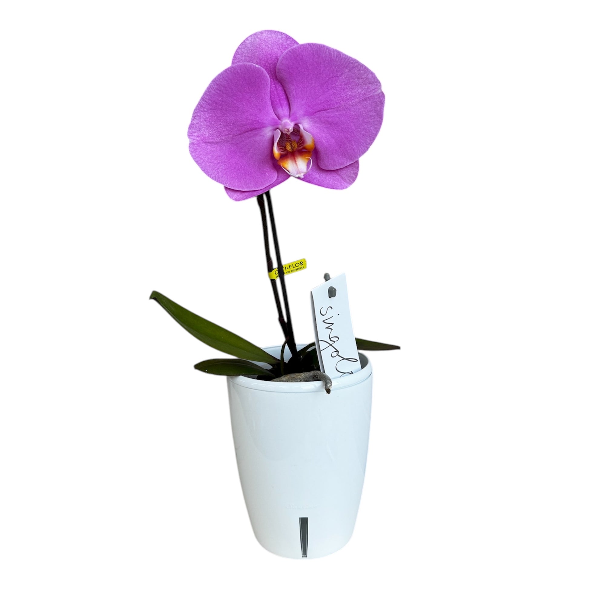 For best display and healthy roots, place your orchid in our Happy Plants Small Self-Watering Pot: