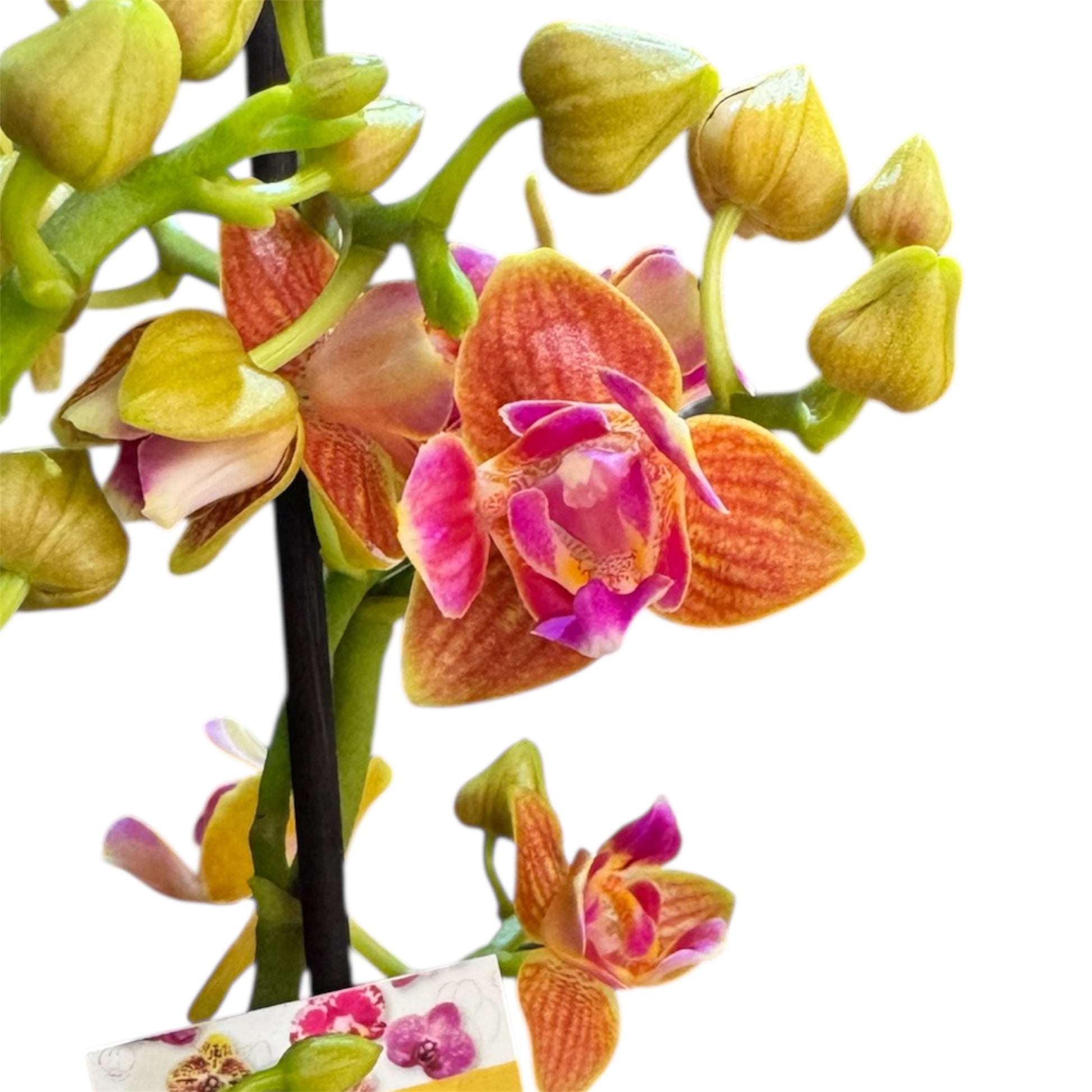 The Phalaenopsis Orchid Yaphon Perfume is a striking scented variety known for its warm, exotic colouring and gentle fragrance. Featuring rich copper-orange petals blended with vibrant pink and purple tones, this orchid offers both visual impact and subtle perfume. Its compact size and elegant flower form make it ideal for windowsills, desks, or gifting.